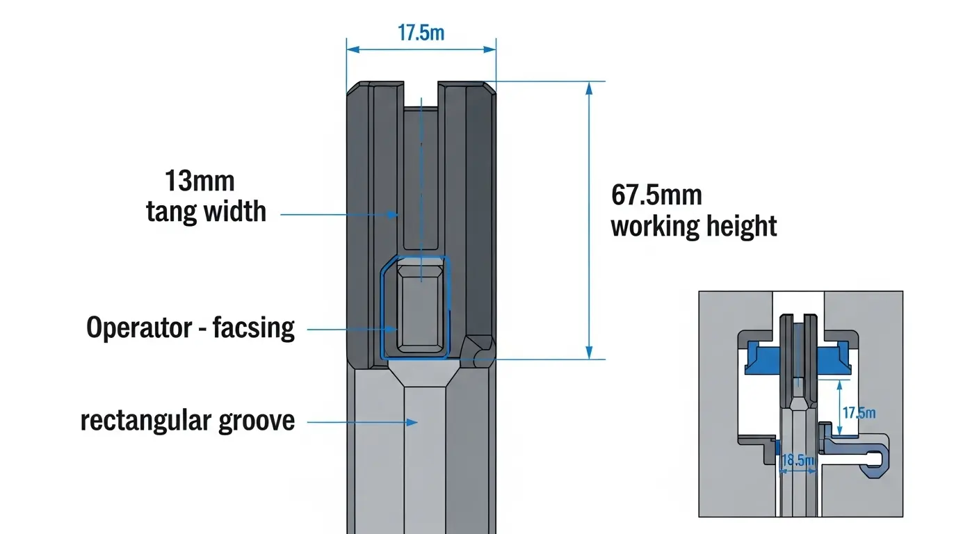 | Tang groove | Rectangular, operator-facing | Front and back grooves |