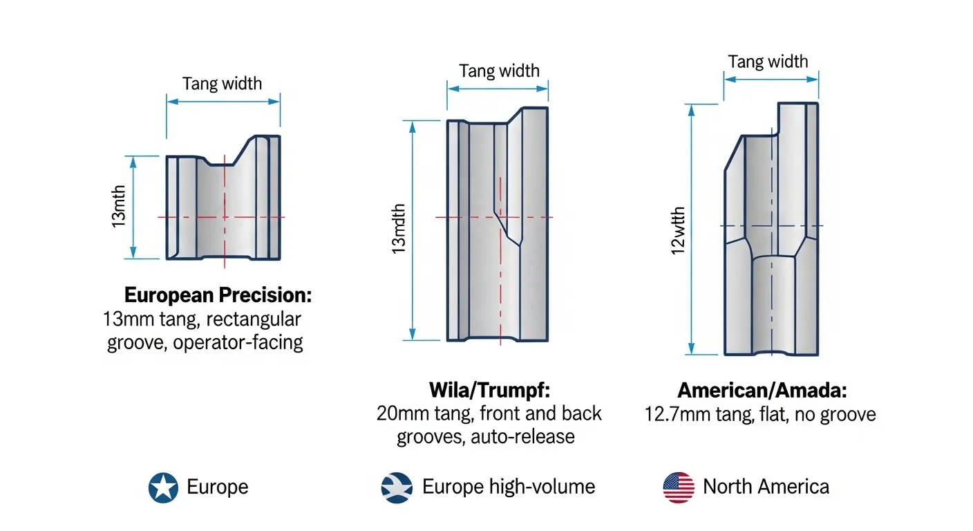 Three press brake tooling systems are used globally: European Precision (13mm tang), 윌라/트럼프 (20mm tang), and American/Amada style (12.7mm tang). The three systems are not interchangeable. Each requires a specific machine receiver and holder configuration — a 13mm European Precision punch will not fit a 20mm Wila/Trumpf holder and vice versa.