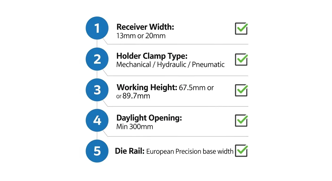 Before purchasing any press brake described as European-type tooling compatible, verify these five machine-side specifications against the technical data sheet. Every point below corresponds to a real machine dimension or mechanical requirement — not a marketing description.