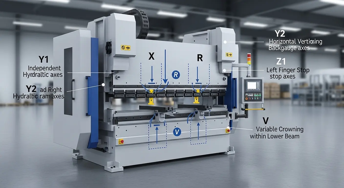 다축 CNC 프레스 브레이크는 여러 제어된 축을 사용합니다—일반적으로 램은 Y1/Y2입니다, X와 R은 백게이지입니다, 손가락 간격을 위한 Z1/Z2, V는 크라우닝으로, 깊이를 자동으로 굽히는 역할을 합니다, 위치, 그리고 각도 보상. A 4‑axis machine suits straightforward, repetitive parts, a 6‑axis machine handles stepped flanges and moderate complexity, and an 8‑axis press brake supports complex, asymmetrical geometries with minimal repositioning. The best choice depends on your part complexity, batch mix, 정확도 요구 사항, and automation plans.
