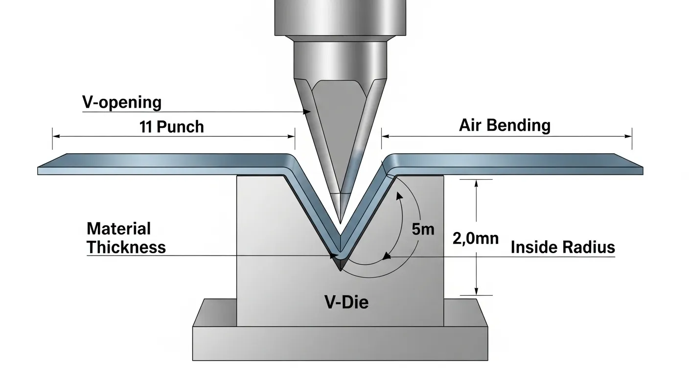 그 의 규칙 8 이상적인 V-다이 개구부는 재료 두께의 8배여야 한다는 기본 제작 지침입니다 (8T). 12mm 이상의 재료에 대해, 이 비율은 톤수 요구량을 관리하고 공구 파손을 방지하기 위해 종종 10T 또는 12T로 증가합니다. 올바른 개구부를 선택하면 내부 굽힘 반경이 대략 16% V-폭의.